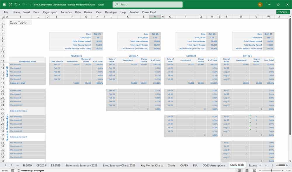 Here’s a comprehensive breakdown of the Excel Financial Models for a CNC Components Manufacturer, covering the Income Statement, Cash Flow Statement, and Balance Sheet. With revenues from up to 80 product lines and a Subscription Add-On. Cost structures and financial statements to forecast the financial health of your CNC Manufacturing. For a 3D Printing model, go here.