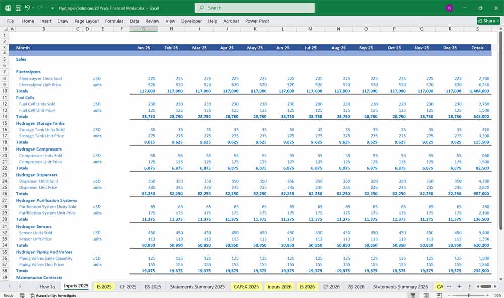 This 20-Year, 3-Statement Excel Hydrogen Solutions Financial Model includes revenue streams from Electrolysers, Fuel Cells, Hydrogen Storage Tanks, Compressors, Dispensors etc. Cost structures and financial statements to forecast the financial health of your Hydrogen Solutions Sales.