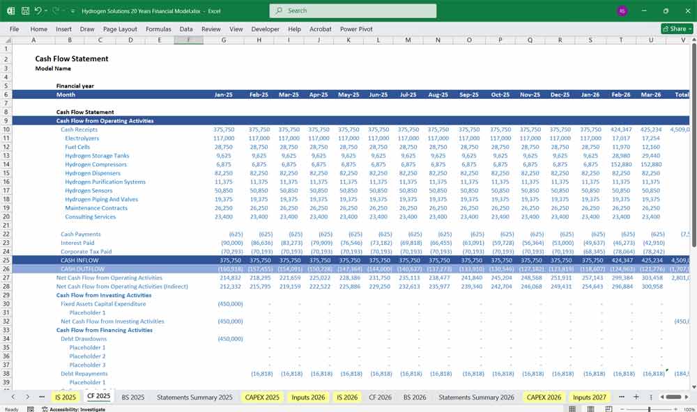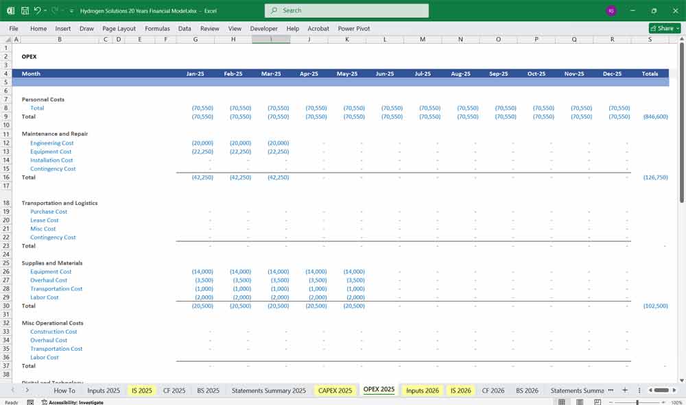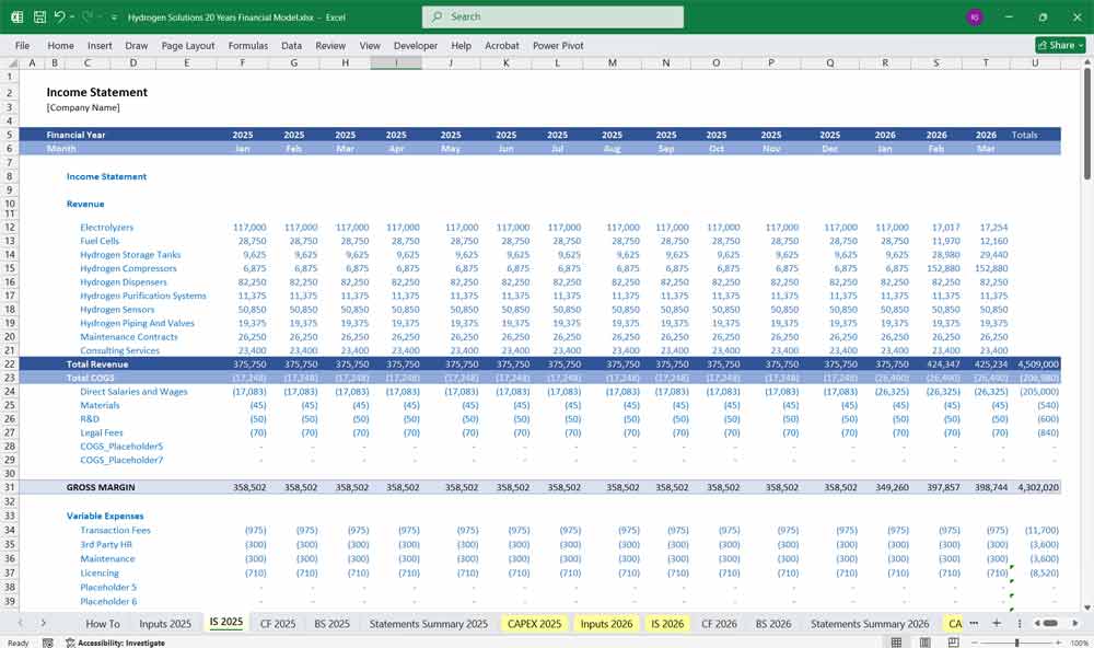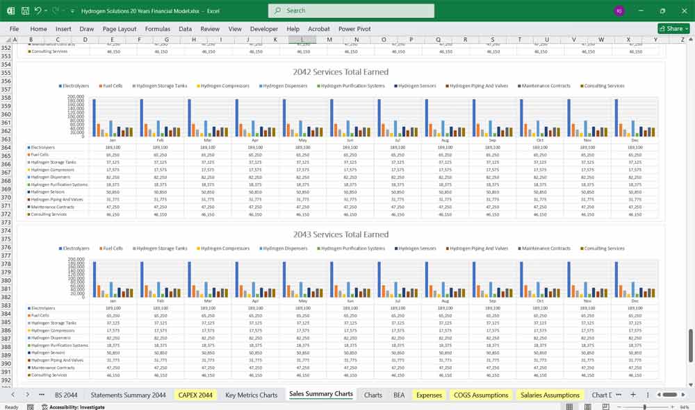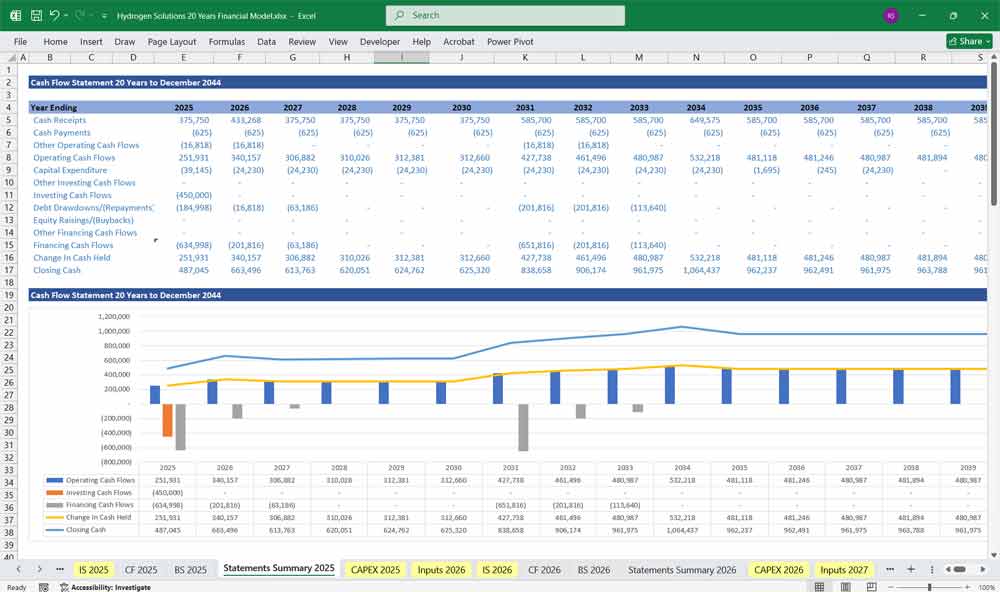 This very extensive 20 Year Hydrogen Solutions Model involves detailed revenue projections, cost structures, capital expenditures, and financing needs. This model provides a thorough understanding of the financial viability, profitability, and cash flow position of your business. Includes: 20x Income Statements, Cash Flow Statements, Balance Sheets, CAPEX sheets, OPEX Sheets, Statement Summary Sheets, and Revenue Forecasting Charts with the specified revenue streams, BEA charts, sales summary charts, employee salary tabs and expenses sheets.