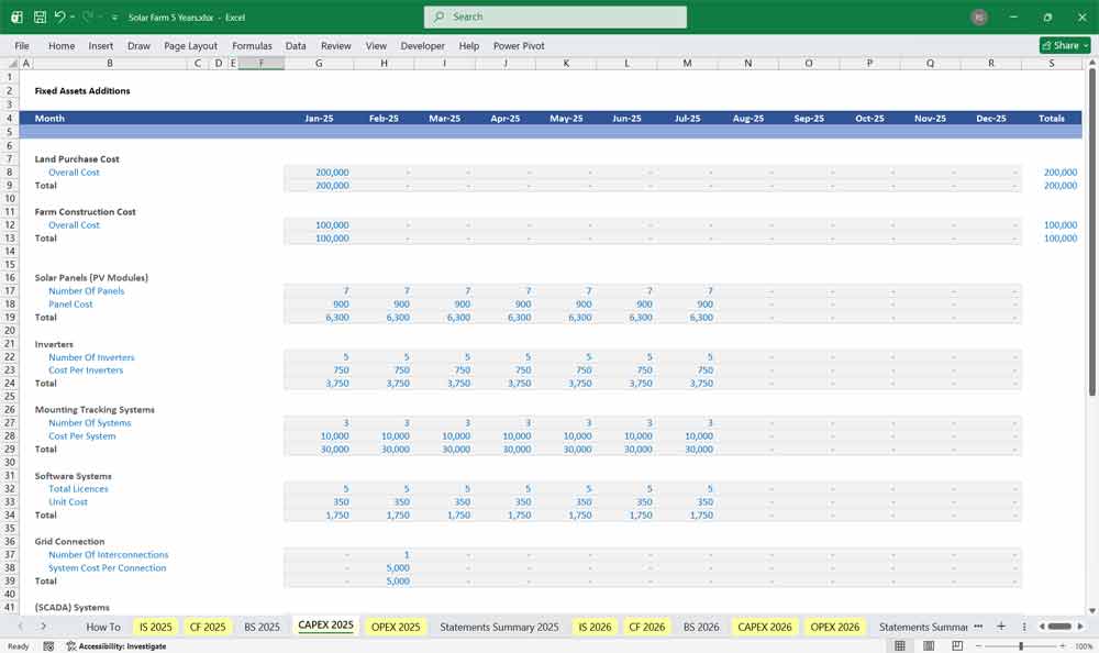 Here’s a comprehensive breakdown of the Excel Financial Model for a Solar Energy Farm, covering the Income Statement, Cash Flow Statement, and Balance Sheet. With cost structures from electricity sales, subsidies, and grants, these financial statements forecast the financial health of your Solar Farm. 20 Year Model.